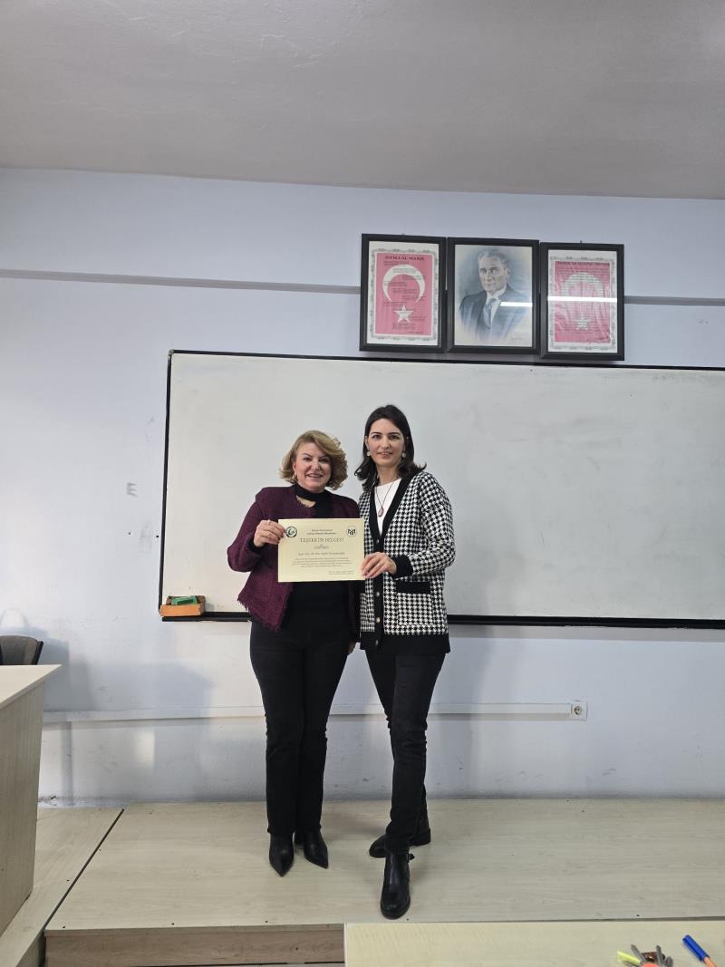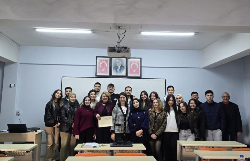 Soru-cevap bölümünün ardından, dersin sorumlusu Öğr. Gör. Dr. Gül SARIKAYA tarafından günün anısına değerli konuğumuza teşekkür belgesi takdimi yapıldı ve öğrencilerle hatıra fotoğrafı çekilerek etkinlik sonlandırıldı.